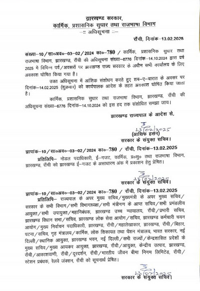 कार्मिक विभाग के संयुक्त सचिव आसिफ हसन ने 13 फरवरी, 2025 को इस संबंध में आदेश जारी कर दिया। कार्मिक विभाग ने जारी आदेश में कहा है कि अधिसूचना संख्या-6776, दिनांक-14.10.2024 द्वारा वर्ष 2025 में विभिन्न पर्व/अवसरों पर झारखंड राज्य सरकार के अधीन सभी कार्यालय के लिए अवकाश घोषित किया गया है।