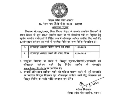 पटना। बिहार में अब प्रधान शिक्षक की भर्ती निकली है। बिहार लोक सेवा आयोग ने 40,247 पदों पर प्रधान शिक्षकों की भर्ती निकाली है। 11 मार्च से 2 अप्रैल 2024 तक आवेदन कर सकेंगे। वहीं उच्च माध्यमिक विद्यालयों में प्रिंसिपल के 6061 पदों पर भर्ती निकली है। प्रधान शिक्षक प्रिंसिपल होंगे, लेकिन वो क्लास 1 से 8 तक के लिए होंगे। वहीं, प्रधानाध्यापक के लिए जो बहाली निकली है, उसमें जो प्रिंसिपल बनेंगे, वह क्लास 9 से 10 और 11 से 12 के लिए होंगे।
