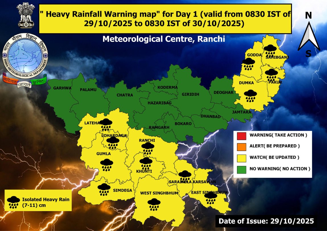अभिषेक आनंद ने बताया कि 29 अक्टूबर को राज्य के कोल्हान क्षेत्र (जमशेदपुर, चाईबासा, सरायकेला-खरसावां) के साथ-साथ रांची और आसपास के जिलों में बारिश हुई है। वहीं राज्य के अन्य हिस्सों में भी हल्की से मध्यम बारिश होती रहेगी। उन्होंने कहा कि “मोंथा के प्रभाव से लगातार नमी बढ़ी हुई है, जिससे बादल घने बने हुए हैं और अगले 24 घंटों तक रुक-रुककर बारिश जारी रह सकती है।”