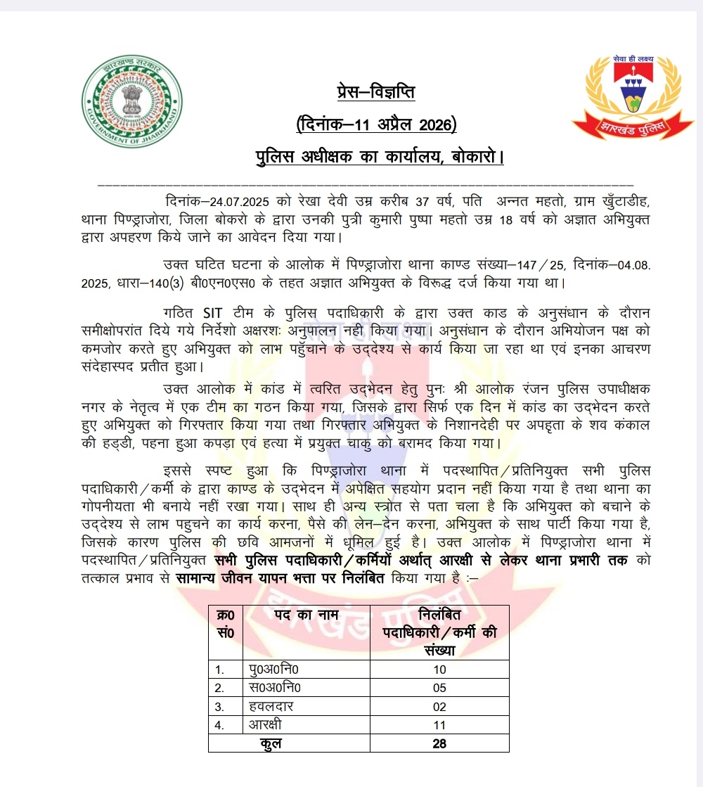 28 police suspension: बोकारो में पुष्पा महतो अपहरण और हत्या मामला अब बड़ा प्रशासनिक एक्शन हुआ है। 24 जुलाई 2025 को युवती के गायब होने की सूचना उसकी मां ने पुलिस को दी थी, लेकिन हैरानी की बात यह रही कि इस मामले में प्राथमिकी (FIR) 10 दिन बाद, यानी 4 अगस्त को दर्ज की गई। इस देरी ने शुरू से ही पुलिस की कार्यप्रणाली पर सवाल खड़े कर दिए थे।