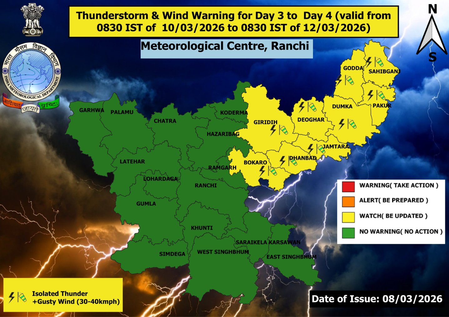 मौसम विभाग के मुताबिक इस दौरान कुछ क्षेत्रों में 30 से 40 किलोमीटर प्रति घंटे की रफ्तार से तेज हवाएं भी चल सकती हैं। ऐसे में लोगों को सतर्क रहने की सलाह दी गई है। Jharkhand Weather Update के अनुसार सोमवार 9 मार्च को बोकारो, हजारीबाग, गिरिडीह, कोडरमा, देवघर, दुमका, गोड्डा, साहिबगंज और पाकुड़ जिलों में आंशिक बादल छाए रहने के साथ हल्की बारिश हो सकती है।