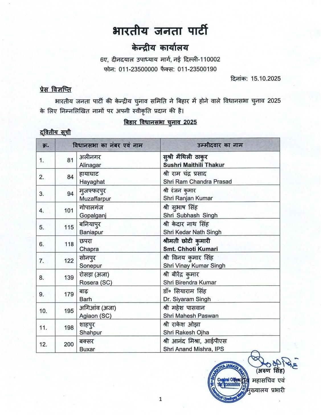 ब्रेकिंग- गायिका मैथली ठाकुर को भाजपा ने दिया टिकट, जानिये किस सीट से लड़ेगी चुनाव, इस IPS को भी बनाया प्रत्याशी