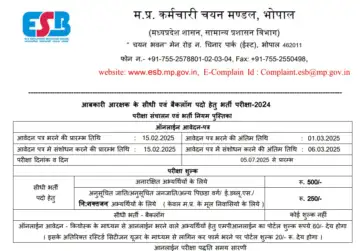 जो भी अभ्यर्थी पुलिस विभाग में सरकारी नौकरी पाना चाहते हैं वे इस भर्ती में भाग लेने के लिए ऑनलाइन माध्यम से ऑफिशियल वेबसाइट esb.mp.gov.in पर जाकर फॉर्म भर सकते हैं। आवेदन करने की लास्ट डेट 1 मार्च 2025 निर्धारित है। ऑनलाइन आवेदन करने से पहले उम्मीदवार एक बार पात्रता की जांच अवश्य कर लें।