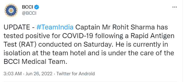 नयी दिल्ली । भारतीय क्रिकेट टीम के कप्तान रोहित शर्मा शनिवार को रैपिड एंटीजन टेस्ट में कोरोना संक्रमित पाए गए। इसकी जानकारी बीसीसीआई ने ट्विटर के जरिए दी। साथ ही बताया कि कप्तान रोहित शर्मा फिलहाल होटल में आइसोलेशन में है और बीसीसीआई की मेडिकल टीम की देखरेख में है।