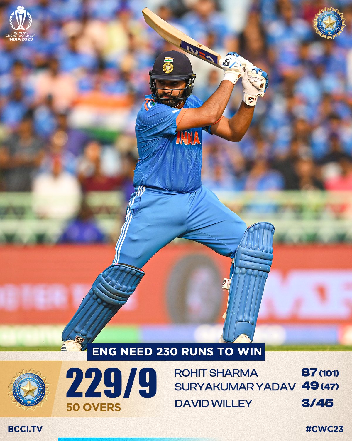 World Cup Cricket : भारत ने इंग्लैंड को जीत के लिए दिया 230 रनों का लक्ष्य, रोहित शतक, तो सूर्यकुमार अर्धशतक से चूके, विराट 0 पर लौटे