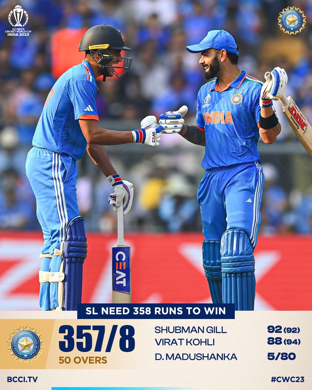 World Cup IND-SL: टीम इंडिया ने लंका के खिलाफ लगायी चौके-छक्के की झड़ी, 357 रनों का खड़ा किया पहाड़
