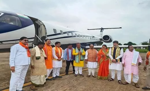 रायपुर। छत्तीसगढ़ के मुख्यमंत्री विष्णु देव साय की अगुवाई में आज उनका पूरा मंत्रिमंडल अयोध्या राम मंदिर के लिए रवाना हो गया हैं। जहां सीएम साय रामलला के दर्शन कर छत्तीसगढ़ की ख़ुश हाली की कामना करेंगे। इस दौरान रामलला को शिवरीनारायण से बेर फल के साथ विष्णु भोग चावल, कोसा वस्त्र, करी लड्डू, अनरसा और सीताफल सहित अन्य सामग्री भी भेंट करेंगे। वहीं अयोध्या के लिए मुख्यमंत्री विष्णु देव साय के साथ भाजपा प्रदेश अध्यक्ष अरुण साव, मंत्री श्याम बिहारी जायसवाल, मंत्री लखनलाल देवांगन, मंत्री टंकराम वर्मा, मंत्री लक्ष्मी राजवाड़े, मंत्री दयाल दास बघेल संग विशेष विमान से रवाना हुए।