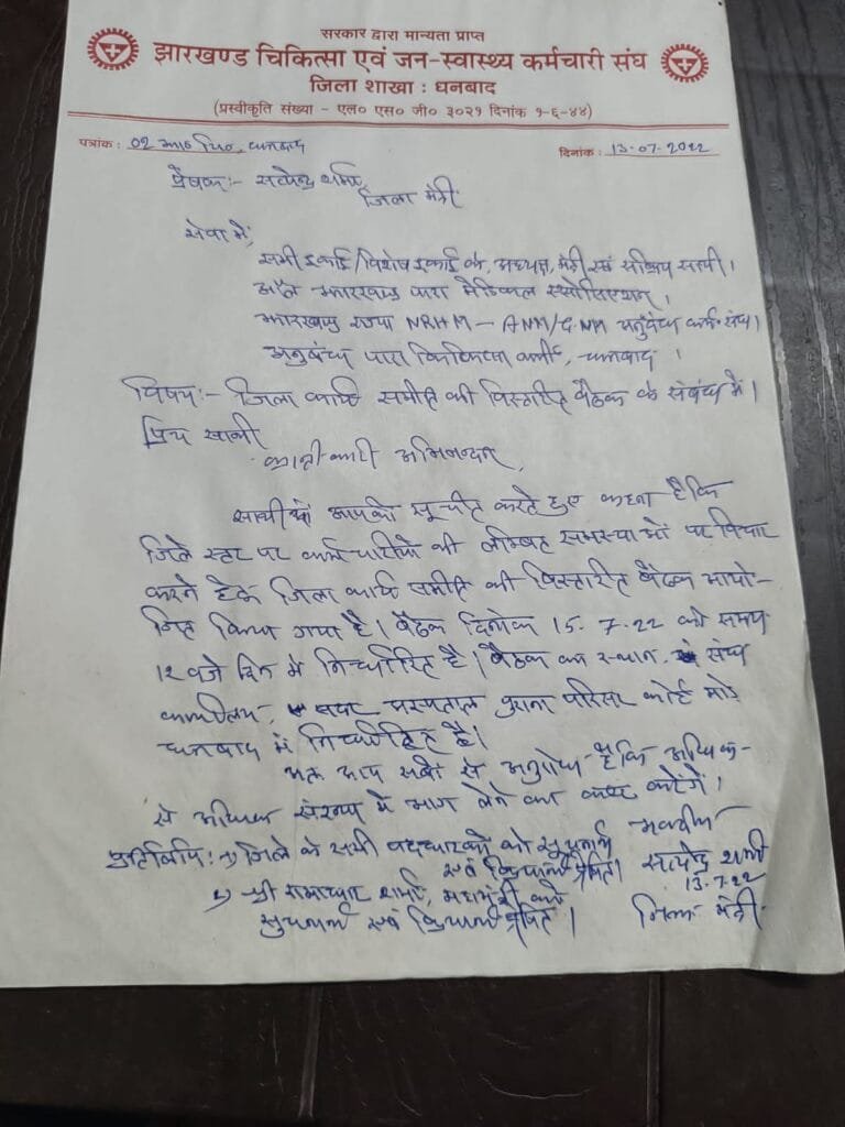 झारखंड चिकित्सा जन- स्वास्थ्य कर्मचारी संघ के जिला मंत्री द्वारा सभी संगठन एवम धनबाद जिला अंतर्गत सभी इकाई मंत्री/विशेष इकाई मंत्री को भेजे पत्र में कहा है कि कर्मचारियों की लंबित मांग को लेकर कार्य समिति की विस्तारित बैठक आयोजित की गई है जिसमे सभी संघठन से सभी सदस्यों के साथ बैठक में आने का आग्रह किया गया है।