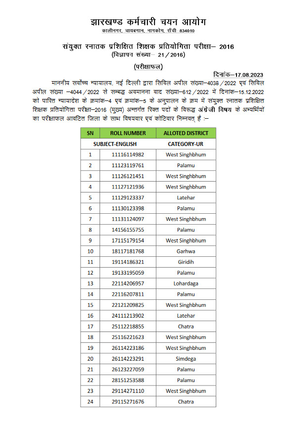 रांची। सुप्रीम कोर्ट के निर्देश के बाद स्नातक प्रशिक्षित शिक्षक प्रतियोगिता परीक्षा 2016 की भर्ती प्रक्रिया जारी है। JSSC की तरफ से से लगातार नियुक्तियां और सर्टिफिकेट वैरिफिकेशन का काम किया जा रहा है। इसी कड़ी में गुरुवार को कर्मचारी चयन आयोग ने अग्रेजी और बांग्ला विषय के शिक्षकों का रिजल्ट जारी कर विषयवार जिला आवंटित किया।