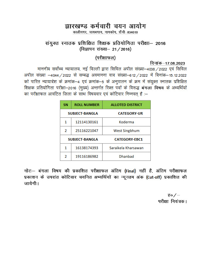 अंग्रेजी विष्य केलिए सामान्य, एसटी, ईबीसी और बीसी वर्ग के लिए अलग-अलग कुल 46 अभ्यर्थियों की सूची जारी की गयी। ये सूची रिक्त पदों को विरुद्ध जारी की गयी है। वहीं बांग्ला विषय के लिए चार अभ्यर्थियों का रिजल्ट जारी किया गया है। अब अंतिम परीक्षाफल के बाद कोटिवार चयनित अभ्यर्थियों का न्यूनतम अंक कट ऑफ जारी किया जायेगा।