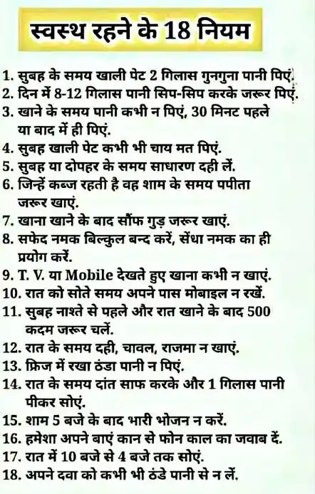 Health Tips: रोजमर्रा की भागदौड़ वाली जिंदगी में आज सबसे बड़ी चुनौती खुद को स्वस्थ रखने की होती है। क्योंकि अनियमित खानपान, पौष्टिक भोजन का अभाव सहित कई ऐसे मुद्दे है जो हमारे सेहत पर बुरा प्रभाव डालता है। जीवन में कुछ ऐसे नियम है जिसका पालन अनिवार्य होता है।