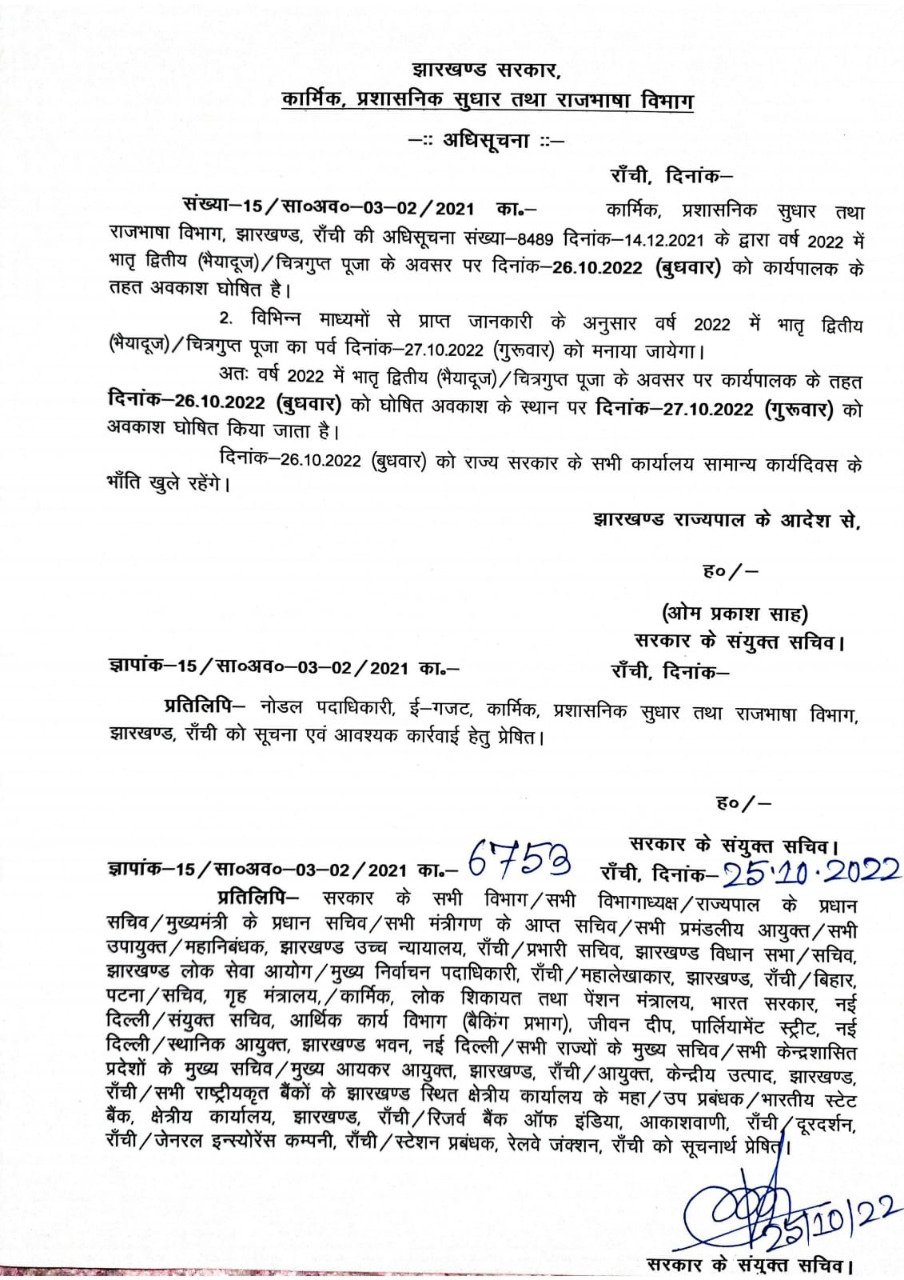 रांची। राज्य सरकार ने चित्रगुप्त पूजा और भाई दूज की छुट्टी में बदलाव किया है। पूर्व आदेश में संशोधन करते हुए नया निर्देश जारी किया गया है। सामाजिक संगठनों की तरफ की मांगों पर विचार करते हुए राज्य सरकार ने छुट्टी में संशोधन का आदेश जारी किया है। कार्मिक विभाग ने चित्रगुप्त पूजा और भाई दूज की छुट्टी अब 26 अक्टूबर के बजाय 27 अक्टूबर को दी जायेगी।