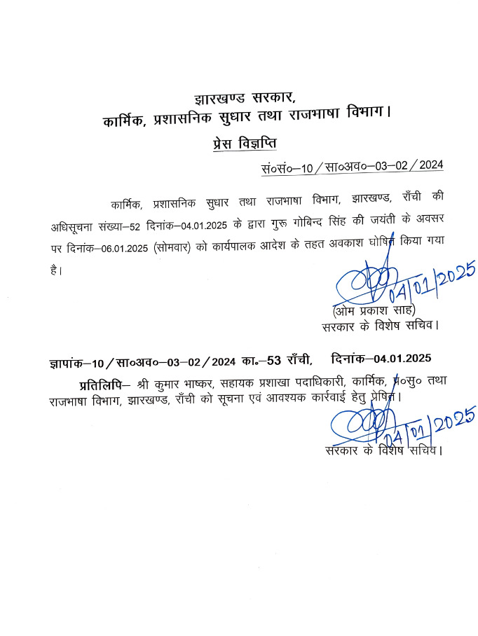 झारखंड में छुट्टी का आदेश: सोमवार को राज्य भर में रहेगी छुट्टी, कार्मिक विभाग ने जारी किया आदेश, पढ़िये..