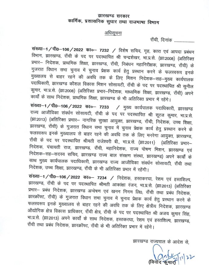 IAS NEWS : झारखंड के तीन IAS अफसरों को मिली गुजरात में चुनाव कराने की जिम्मेदारी… झारखंड के इन तीन अफसरों को मिला इनके विभागों का एडिश्नल चार्ज