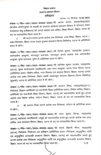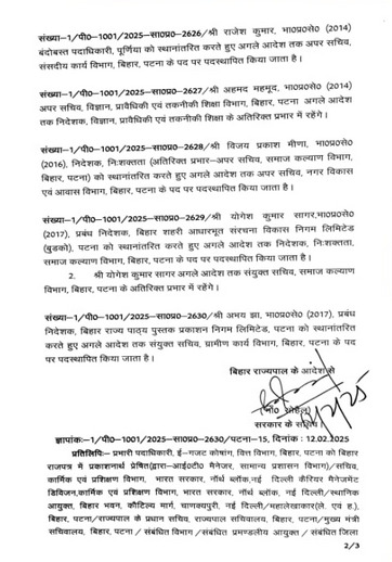 IAS Transfer News: राज्य सरकार ने बड़ी संख्या में IAS अफसरों का तबादला किया है। केंद्रीय प्रतिनियुक्ति से लौटे अजय यादव को नया शिक्षा सचिव बनाया है।पटना नगर निगम के आयुक्त अनिमेष कुमार पराशर को बिहार शहरी आधारभूत संरचना निगम के मैनेजिंग डायरेक्टर का अतिरिक्त प्रभार दिया गया है।