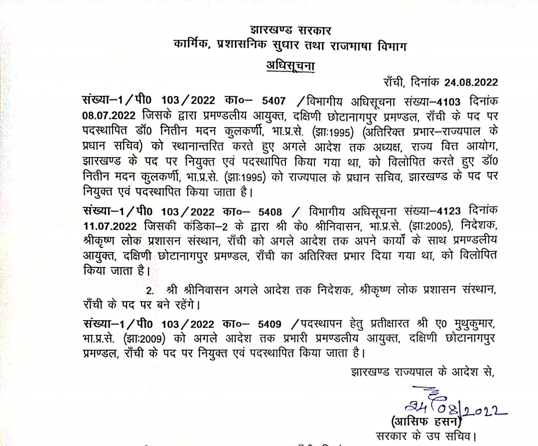वहीं, ए मुथुकुमार को अगले आदेश तक दक्षिणी छोटानागपुर प्रमंडल के प्रभारी प्रमंडलीय आयुक्त के पद पर नियुक्त एवं पदस्थापित किया गया है।