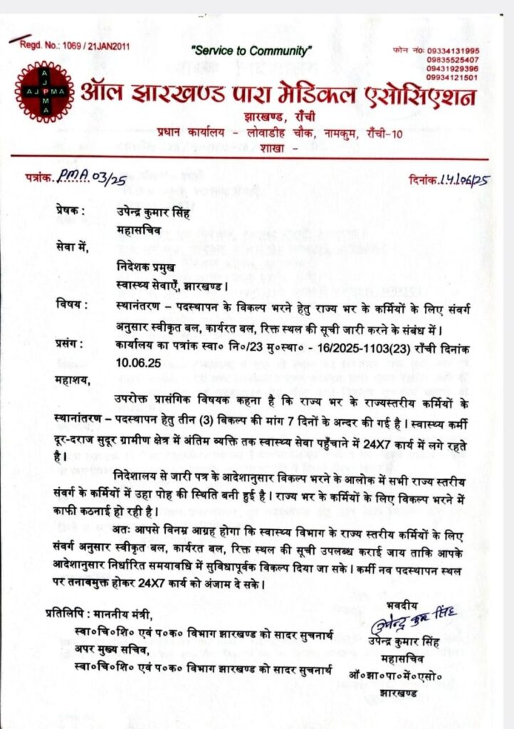 ऑल झारखंड पारा मेडिकल एसोसिएशन ने लिखा पत्र