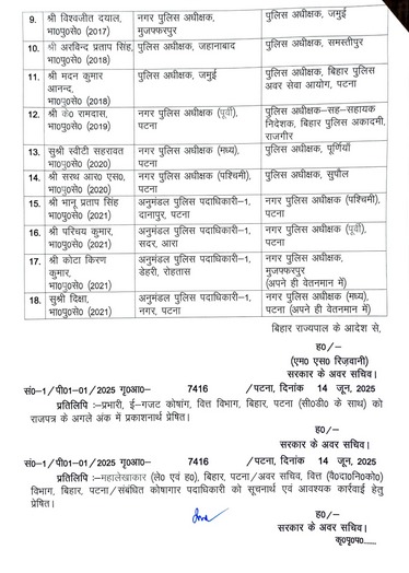 इस बदलाव के तहत पटना के एसएसपी अवकाश कुमार को हटाकर कार्तिकेय शर्मा को नया एसएसपी नियुक्त किया गया है। वहीं, कार्तिकेय शर्मा 2014 बैच के आईपीएस अधिकारी हैं और अब वे राजधानी की कानून-व्यवस्था की जिम्मेदारी संभालेंगे. अवकाश कुमार को बीएमपी-1 में भेजा गया है।