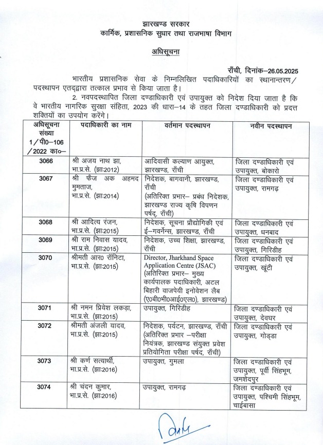 तबादले की सूची में जिन अधिकारियों को नए जिलों की कमान सौंपी गई है, उनमें कई युवा और अनुभवी अफसर शामिल हैं। नमन लकड़ा को देवघर, जबकि फैज अक अहमद को रामगढ़ का नया उपायुक्त नियुक्त किया गया है। अजय नाथ झा अब बोकारो जिले की जिम्मेदारी संभालेंगे।