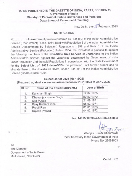 Jharkhand IAS News: राज्य प्रशासनिक सेवा के 6 अधिकारी आईएएस बन गये हैं। डीओपीटी की तरफ से इसे लेकर नोटिफिकेशन जारी कर दिया है। पिछले दिनों प्रमोशन के लिए डीपीसी दिल्ली में हुई थी, जिसके बाद अब प्रमोशन का नोटिफिकेशन जारी किया गया है। साल 2023 की रिक्तियों के विरुद्ध इन सभी को प्रोन्नति मिली है। इनमें कंचन सिंह, धनंजय कुमार सिंह, सीता पुष्पा, बिजय कुमार सिन्हा, प्रीति रानी और राजेश प्रसाद के नाम शामिल हैं।