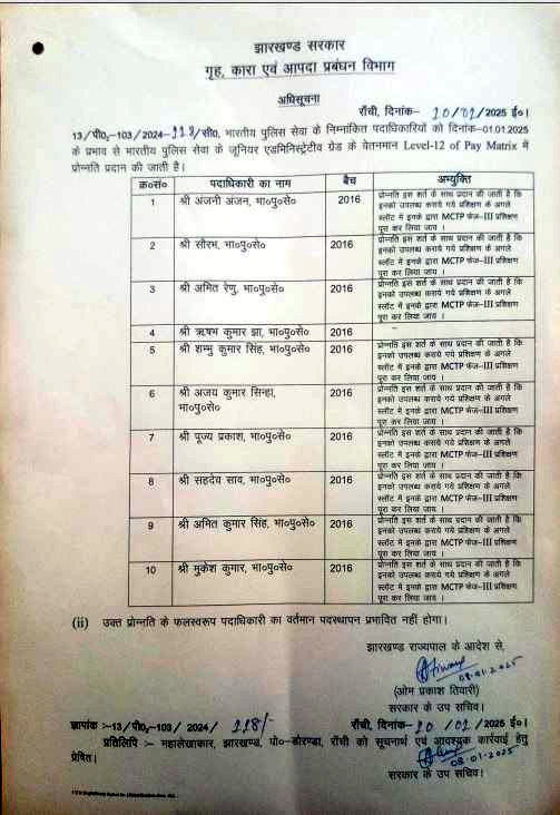 झारखंड सरकार की ओर से जो अधिसूचना जारी की गई है, उसमें प्रोन्नति की शर्त भी लगाई गई है। प्रमोशन पाने वाले आईपीएस अफसरों को अगले स्लॉट में एमसीटीपी फेज-III प्रशिक्षण लेना होगा। 10 जनवरी 2025 को सरकार के उप सचिव ओम प्रकाश तिवारी ने झारखंड के राज्यपाल के आदेश से यह अधिसूचना जारी की है।