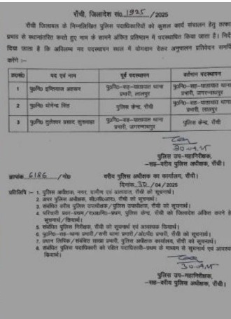 Police Transfer: पुलिस विभाग में तबादले की लिस्ट जारी हुई है। पुलिस इंस्पेक्टर को इधर से उधर किया गया है। रांची एसएसपी ने जिला बल के तीन पुलिस अधिकारियों का तबादला किया है।
