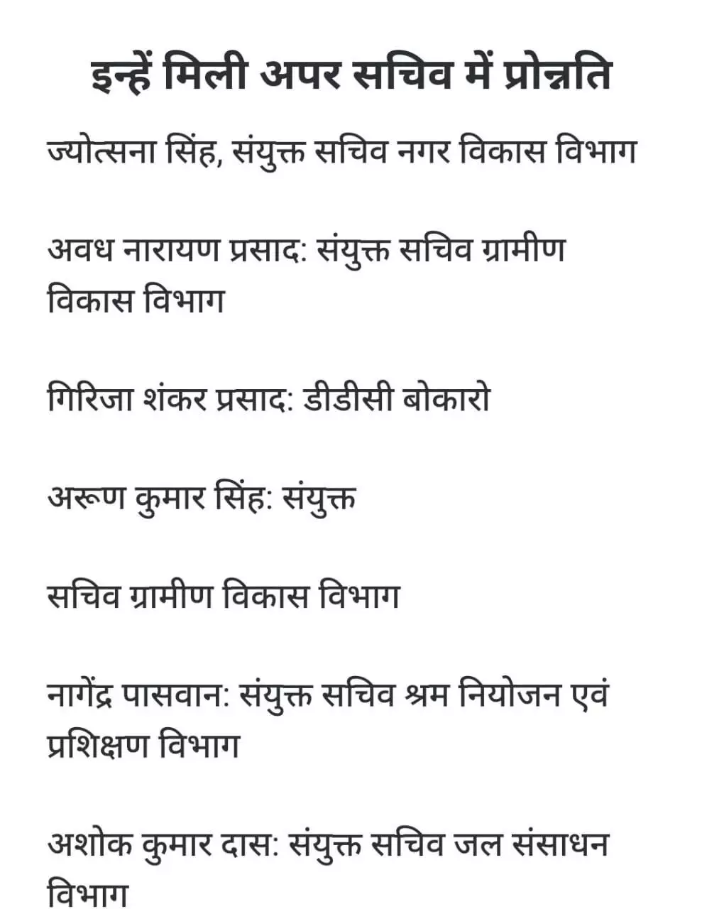 Ranchi। झारखंड प्रशासनिक सेवा के अधिकारियों को राज्य सरकार ने प्रोन्नति दी है। इस संबंध में राज्य सरकार ने अधिसूचना जाती कर दी। राज्य प्रशासनिक सेवा के अधिकारियों को अपर सचिव में प्रोन्नति मिली हैं।