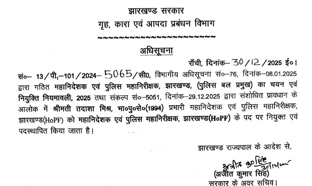 अधिसूचना के अनुसार, यह नियुक्ति झारखंड में पुलिस प्रमुख के चयन एवं नियुक्ति नियमावली-2025 के संशोधित प्रावधानों के तहत की गई है। खास बात यह है कि तदाशा मिश्रा 31 दिसंबर 2025 को सेवानिवृत्त होने वाली थीं, लेकिन राज्य सरकार ने 29 दिसंबर को नियमावली में संशोधन कर उन्हें नियमित डीजीपी नियुक्त करने का निर्णय लिया। इस फैसले को प्रशासनिक और सुरक्षा व्यवस्था के लिहाज से बेहद महत्वपूर्ण माना जा रहा है।