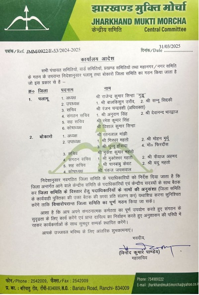 Jharkhand Mukti Morcha News : झारखंड मुक्ति मोर्चा ने जिला समितियों का गठन कर दिया है। सभी पंचायत समितियों, वार्ड समितियों, प्रखंड समितियों, महानगर और नगर समिति के गठन के बाद दो और जिला समिति का गठन किया है।