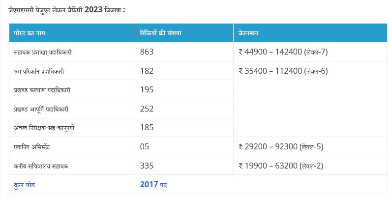 आपको बता दें कि झारखण्ड SSC द्वारा जेएसएससी ग्रेजुएट लेवल भर्ती 2023 के लिए टेक्निकल ग्रेजुएट उम्मीदवारों से ऑनलाइन आवेदन आमंत्रित किए जाते है। इस जेएसएससी टेक्निकल ग्रेजुएट लेवल भर्ती 2023 के तहत कुल मिलाकर 2017 रिक्त पदों को भरने को घोषणा की गयी है, जिनमें निम्नलिखित पद शामिल किये गए है।