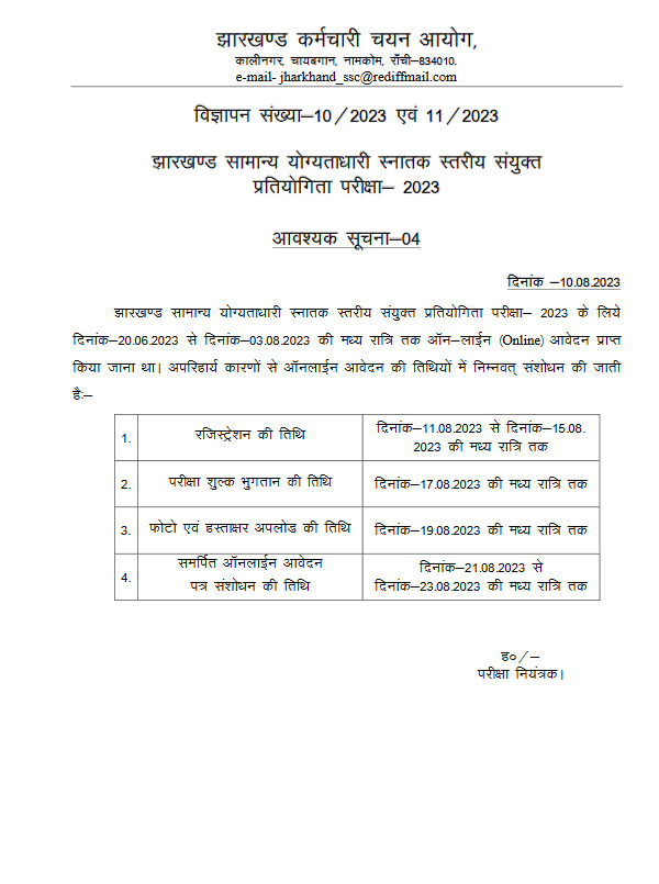 रांची। झारखंड सामान्य योग्यताधारी स्नातक स्तरीय संयुक्त प्रतियोगिता परीक्षा के लिए आवेदन की तारीख बढ़ा दी गयी है। पहले आवेदन की तारीख 20 जून 2023 से 3 अगस्त 2023 तक रखी गयी थी, लेकिन लेकिन कुछ अभ्यर्थियों की शिकायत थी, कि तकनीकी वजहों से वो फार्म नहीं भर सके हैं, लिहाजा JSSC ने अभ्यर्थियों की सुविधा का ख्याल रखते हुए आवेदन की तारीख में बदलाव किया है।
