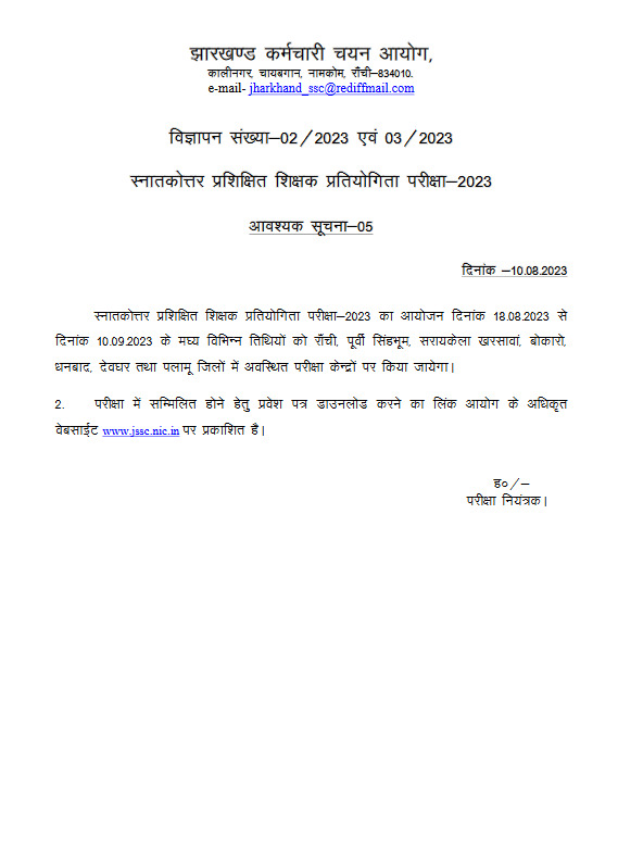 18 अगस्त से लेकर 10 सितंबर तक प्रशिक्षित शिक्षक प्रतियोगिता परीक्षा प्रदेश के रांची, पूर्वी सिंहभूम, सरायकेला खरसावां, बोकारो, धनबाद, देवघर व पलामू जिला में आयोजित की जायेगी। इन जिलो में JSSC की तरफ से अलग-अलग केंद्र बनाये गये हैं।