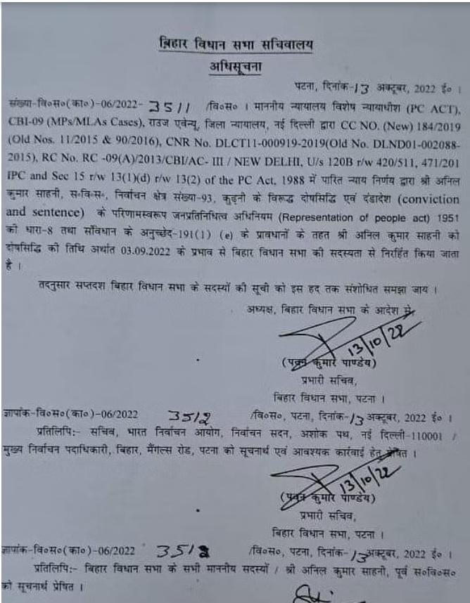 आरजेडी विधायक अनिल साहनी की सदस्यता रद्द
