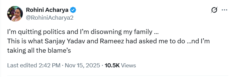 This is what Sanjay Yadav and Rameez had asked me to do …nd I’m taking all the blame’s— Rohini Acharya (@RohiniAcharya2) November 15, 2025