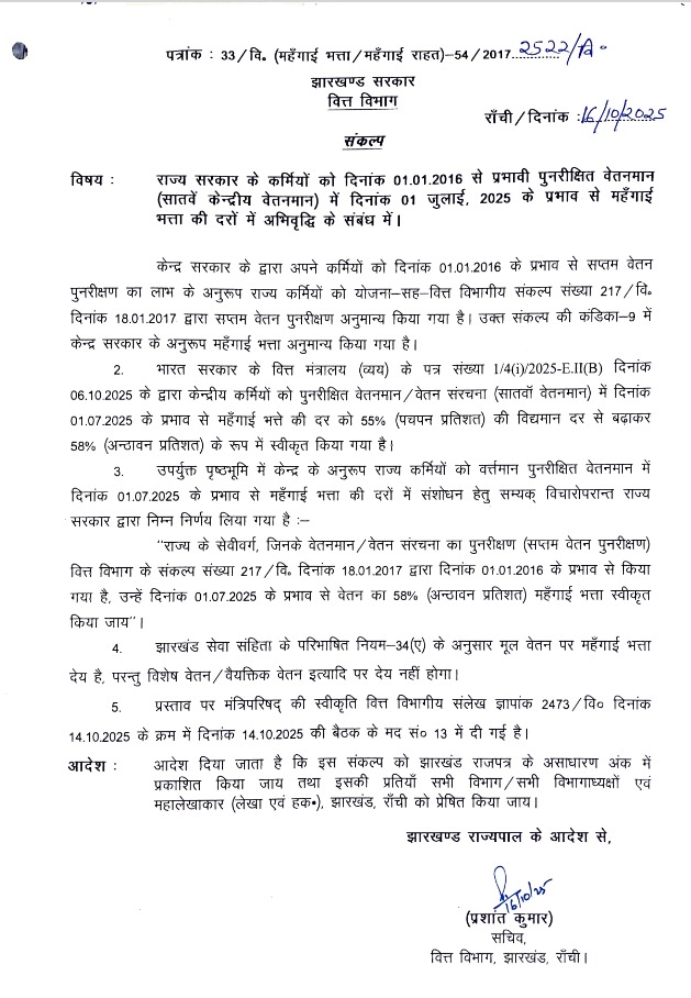 वित्त विभाग ने इस संबंध में संलेख संख्या झापाक 2473/वि. दिनांक 14 अक्टूबर 2025 जारी किया है। इस प्रस्ताव को राज्य मंत्रिपरिषद ने 14 अक्टूबर को हुई बैठक में मद क्रमांक 13 के अंतर्गत स्वीकृति प्रदान की।आदेश में यह भी कहा गया है कि इस संकल्प को झारखंड राजपत्र के असाधारण अंक में प्रकाशित किया जाएगा, ताकि यह औपचारिक रूप से प्रभावी हो सके। साथ ही, इसकी प्रतियां सभी विभागों, विभागाध्यक्षों और महालेखाकार (लेखा एवं हक) झारखंड, रांची को भेजने के निर्देश दिए गए हैं।