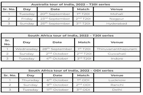 वेन्यू डिसाइड होने के बाद अब स्टेडियम को तैयार करने का नाम शुरू कर दिया जायेगा। आस्ट्रेलिया के साथ तीन टी ट्वेंटी मैच 20 सितंबर को मोहाली, 23 को नागपुर और 25 सितंबर को हैदराबाद में खेले जायेंगे। वहीं साउथ अफ्रीका के साथ तीन टी 20 मैच में पहला मैच 28 सितंबर को तिरूवंतपुरम, 2 अक्टूबर को गुवाहाटी और 4 अक्टूबर को इंदौर में खेजा जायेगा।