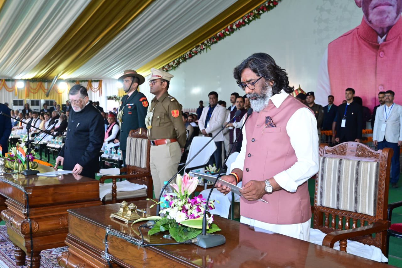 रांची: हेमंत सोरेन चौथी बार झारखंड के सीएम बन गए। उन्हें गुरुवार को रांची के मोरहाबादी मैदान में गवर्नर संतोष गंगवार ने शपथ दिलाई। मंत्रिमंडल का विस्तार बाद में किया जाएगा।