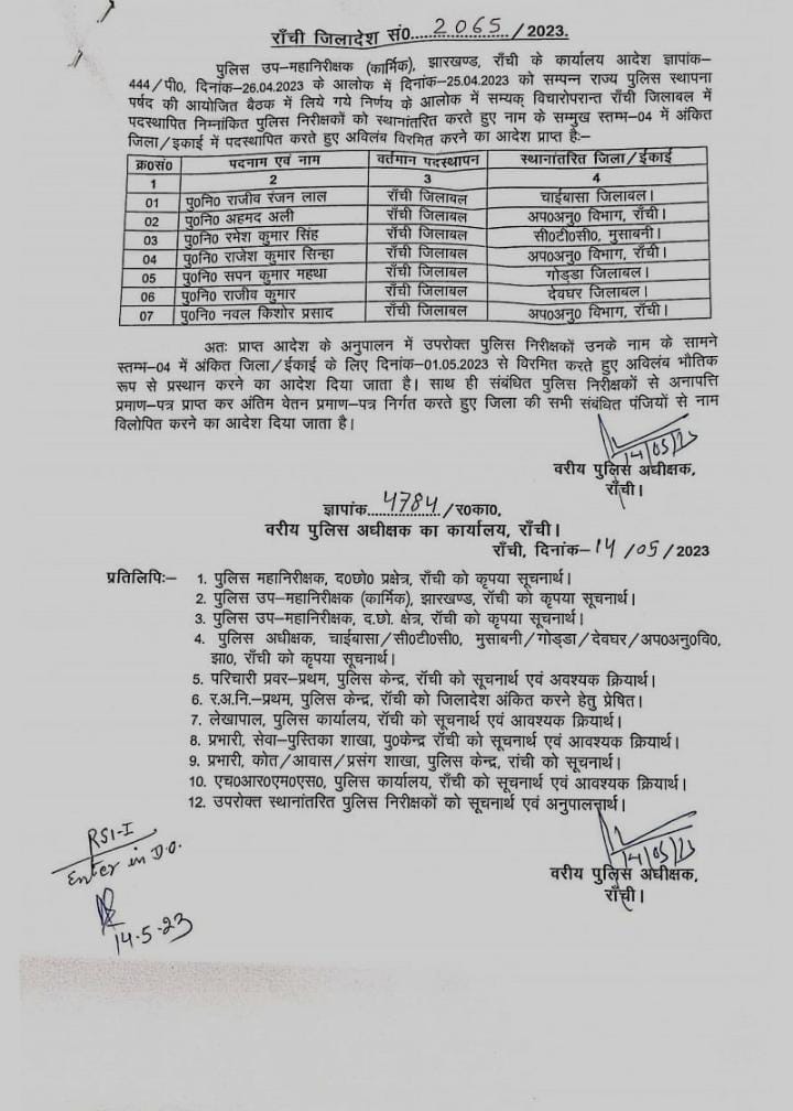 रांची: जिले के सात इंस्पेक्टर्स (पुलिस निरीक्षक) को एसएसपी किशोर कौशल ने विरमित किया है। बता दें कि इन सभी इंस्पेक्टर का तबादला पिछले दिनों हुआ था। SSP द्वारा बताया गया कि पुलिस उप महानिरीक्षक (कार्मिक) के कार्यालय आदेश के आलोक में 25 अप्रैल, 2023 को राज्य पुलिस स्थापना पर्षद की बैठक आयोजित हुई थी. इस बैठक में रांची जिलाबल में पदस्थापित सात इंस्पेक्टर को स्थानांतरित करते हुए विभिन्न थानों में पदस्थापित किया गया था. इसी आलोक में इन सात इंस्पेक्टर को एक मई, 2023 से विरमित करने का आदेश दिया गया।