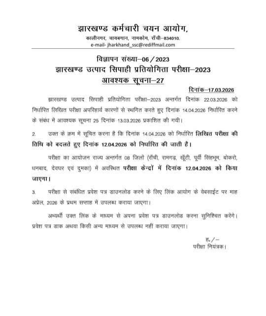 आपको बता दें कि इससे पहले यह परीक्षा 22 मार्च को होनेवाली थी। लेकिन इसमें बदलाव की मांग उठी थी, बताया जा रहा है कि इस दिन सरहुल होने के कारण परीक्षा की तिथि बढ़ाई गई। आयोग ने 13 मार्च को सूचना प्रकाशित कर यह परीक्षा 14 अप्रैल को आयोजित करने की बात कही थी, जबकि इस दिन आंबेडकर जयंती है।