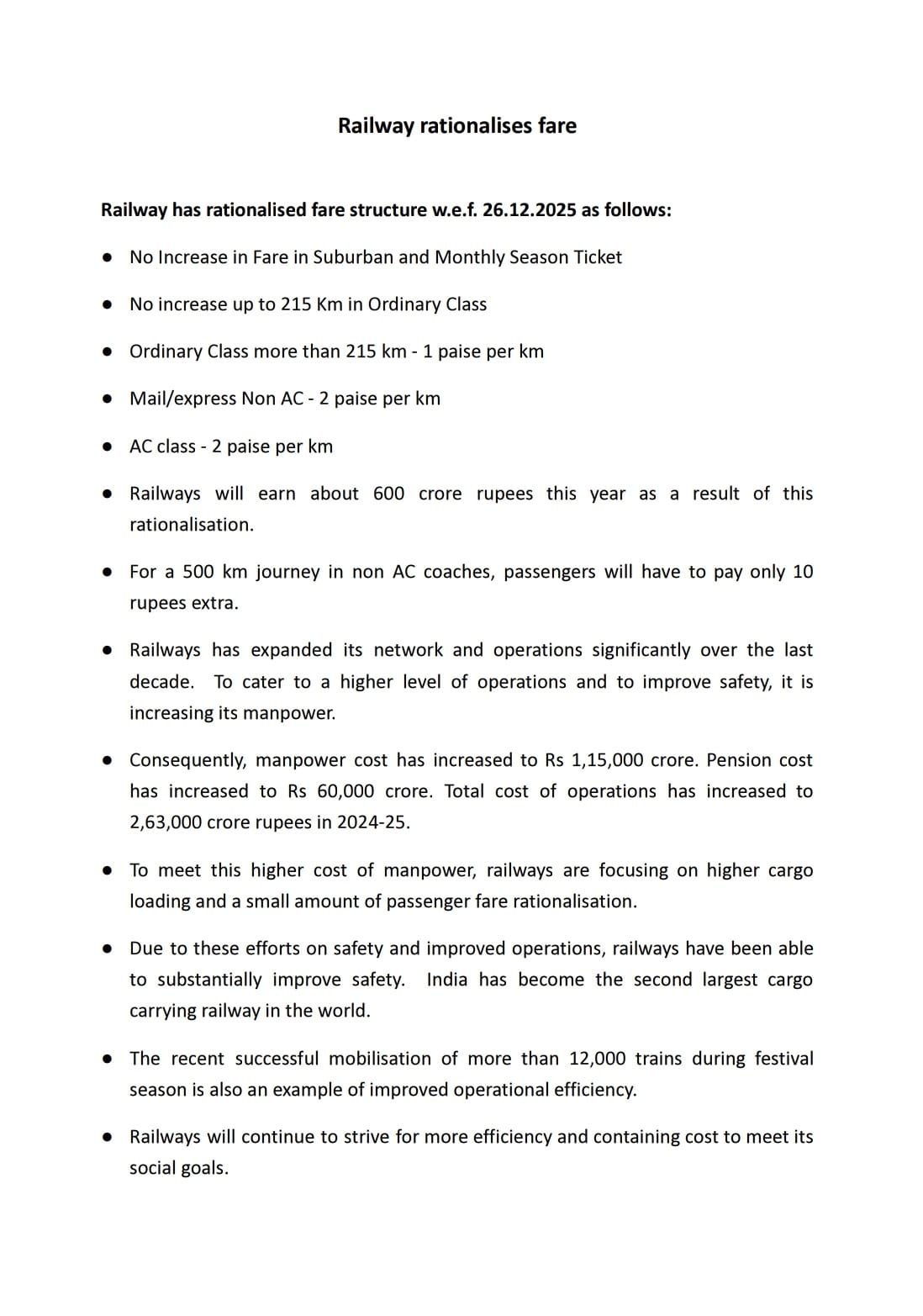 रेलवे का कहना है कि यह बढ़ोतरी यात्रियों पर न्यूनतम असर डालने के उद्देश्य से तय की गई है, ताकि आवश्यक राजस्व भी जुटाया जा सके और आम यात्रियों पर ज्यादा बोझ भी न पड़े।