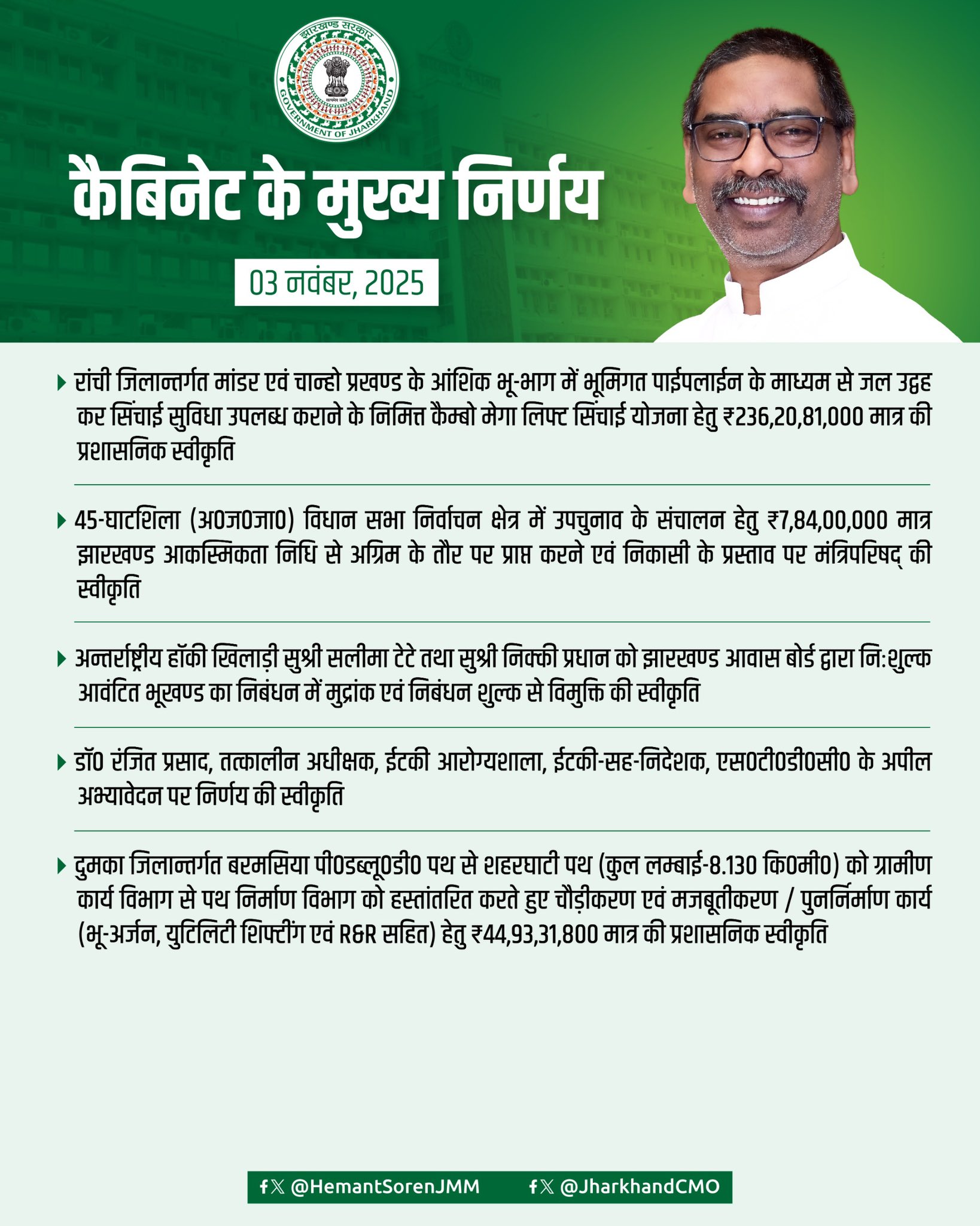 Jharkhand Cabinet All Decesion। झारखंड कैबिनेट ने 13 फैसलों पर मुहर लगायी है। सरकार ने किसानों के हित में एक महत्वपूर्ण कदम उठाते हुए मांडर और चान्हो के 14 गांवों के लिए बहुप्रतीक्षित कैंबो मेगा लिफ्ट सिंचाई परियोजना को हरी झंडी दे दी है। 236 करोड़ 20 लाख 81 हजार रुपये की लागत से तैयार होने वाली यह परियोजना इस क्षेत्र में सिंचाई की समस्या को दूर करेगी और हजारों किसानों को कृषि उत्पादन बढ़ाने में सहायता मिलेगी।