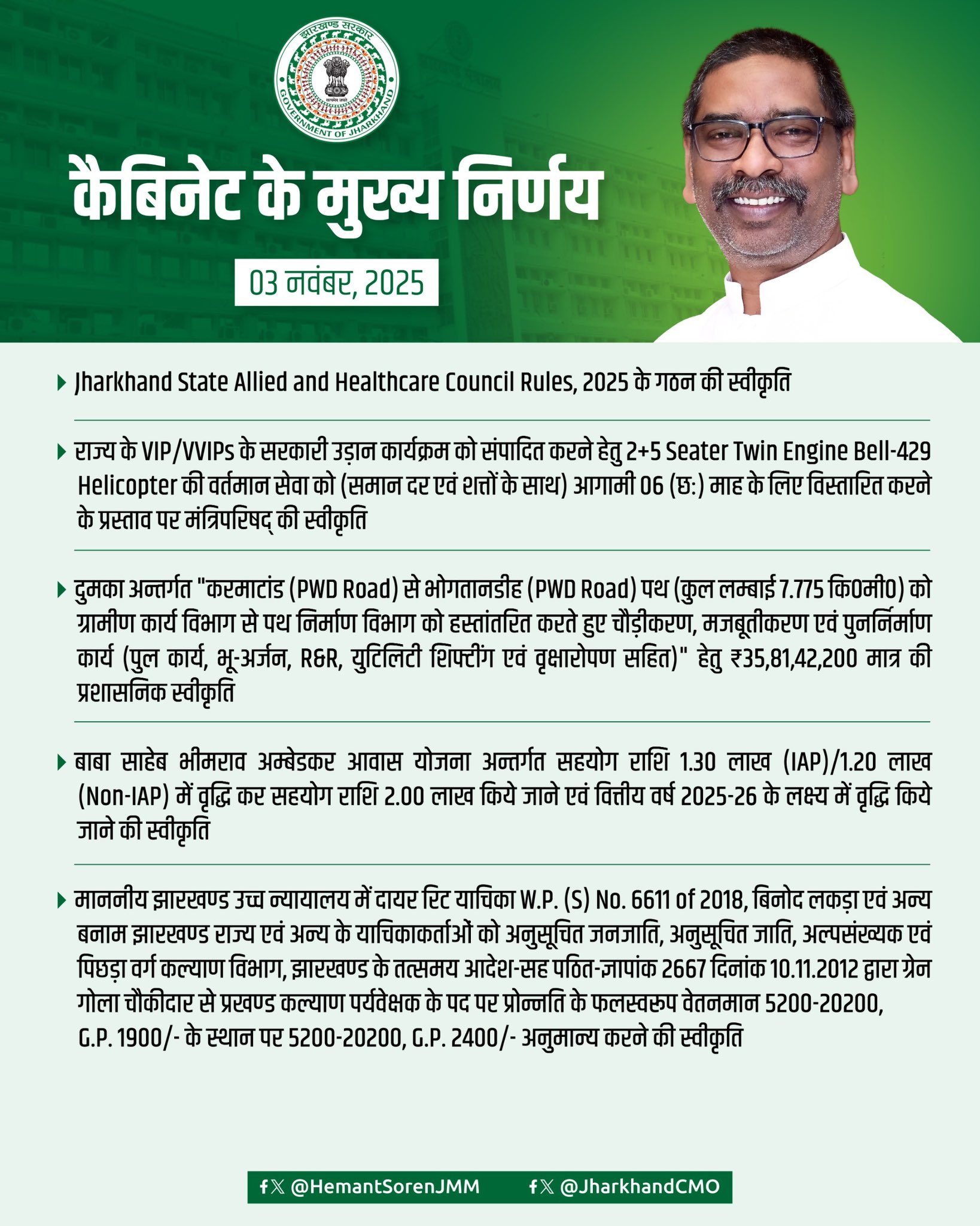 बैठक में एक अनुशासनात्मक कार्रवाई पर भी निर्णय लिया गया। इटकी आरोग्यशाला के वाहन का दुरुपयोग और उसकी चोरी के मामले में दोषी पाए जाने पर डॉ. रंजीत प्रसाद पर संशोधित दंड लागू करने की मंजूरी दी गई।सरकार की हेलीप्टर सेवा (सरकारी उड़ान योजना) पर भी विस्तार का निर्णय लिया गया है। मौजूदा हेलीप्टर सेवा को अगले छह महीने तक बढ़ाने की मंजूरी मिली है, जिससे आपातकालीन सेवाओं, वीवीआईपी मूवमेंट और आपदा प्रबंधन कार्य में सहायता मिलती रहेगी।