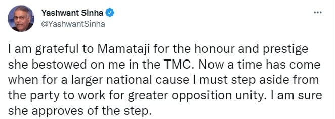बैठक से पहले यशवंत सिन्हा ने राष्ट्रपति पद की उम्मीदवारी को लेकर संकेत दिये हैं। उन्होंने ट्वीट किया है कि TMC ने मुझे जो सम्मान और प्रतिष्ठा दी है, उसके लिए मैं ममता बनर्जी का आभारी हूं। जब एक बड़े राष्ट्रीय उद्देश्य के लिए पार्टी से हटकर एकता के लिए काम करना चाहिये। मुझे यकीन है कि पार्टी मेरे इस कदम को स्वीकार करेगी।