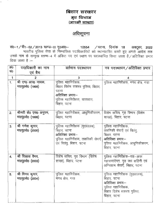 वहीं केएस अनुपम गृह विभाग के विशेष सचिव बनाये गये हैं। जबकि 2000 बैच के गणेश कुमार को आईजी तकनीकी सेवा और विकास वैभव को पटना हेडक्वार्टर का आईजी बनाया गया है उन्हें बिहार सशस्त्र बल का अतिरिक्त प्रभार दिया गया है।