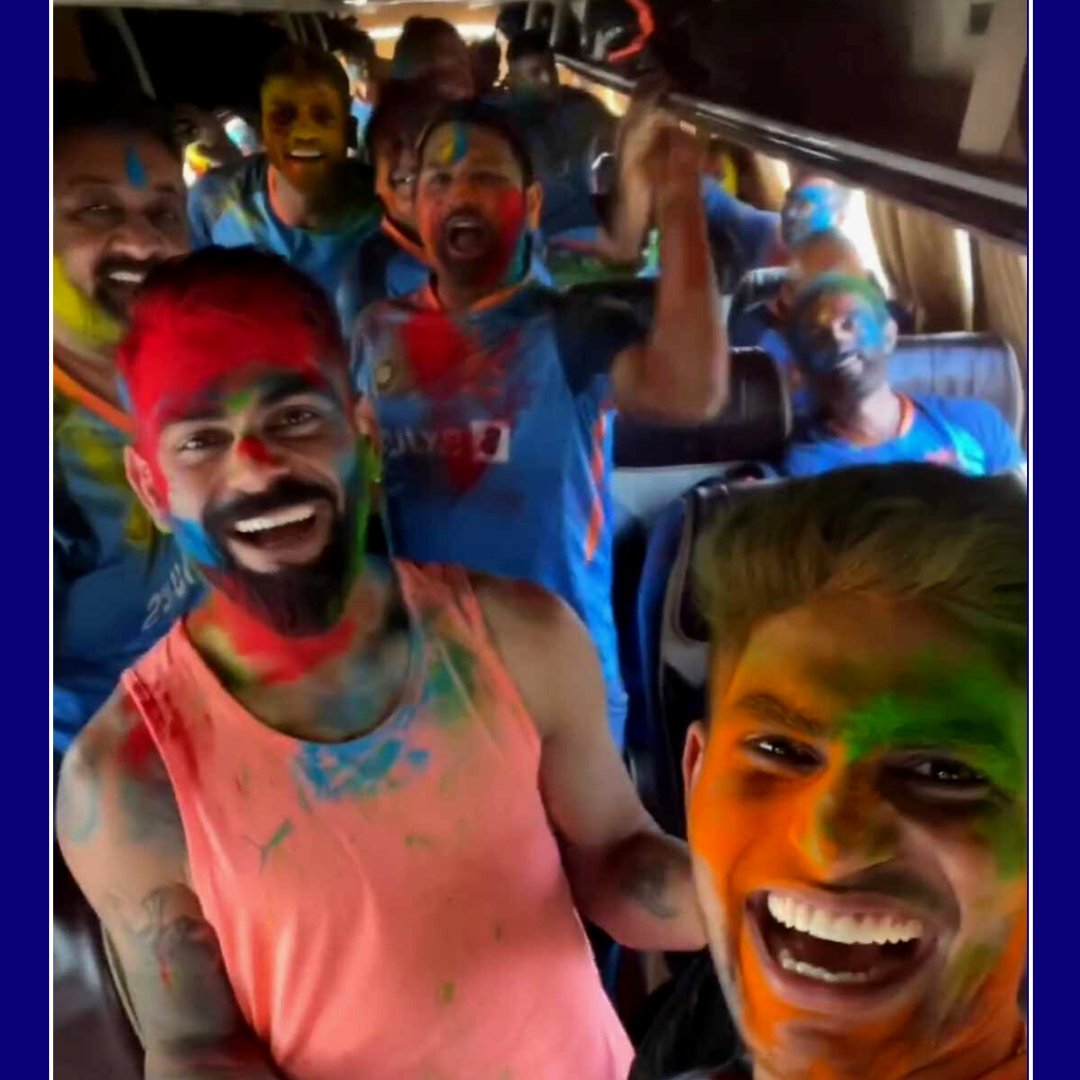 उनके पीछे कप्तान रोहित शर्मा भी दिखे, जिन्होंने गिल को वीडियो बनाते देख दोनों पर गुलाल उड़ाया। टीम के बाकी खिलाड़ी भी बस में ही एक-दूसरे पर गुलाल उड़ाते नजर आए।