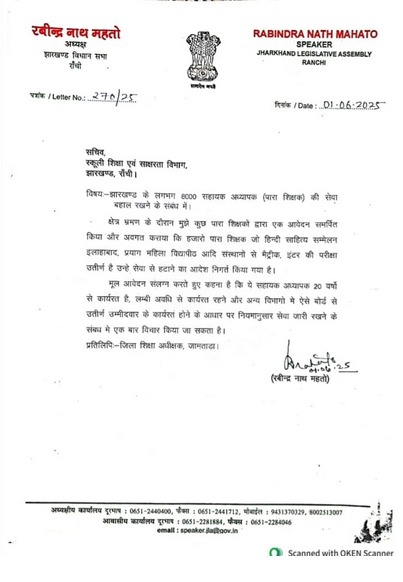 पारा शिक्षक न्यूज: बच जायेगी 8000 पारा शिक्षकों की नौकरी ? अब विधानसभा अध्यक्ष ने लिखा शिक्षा सचिव को पत्र, कहा, इनकी सेवा बहाल….