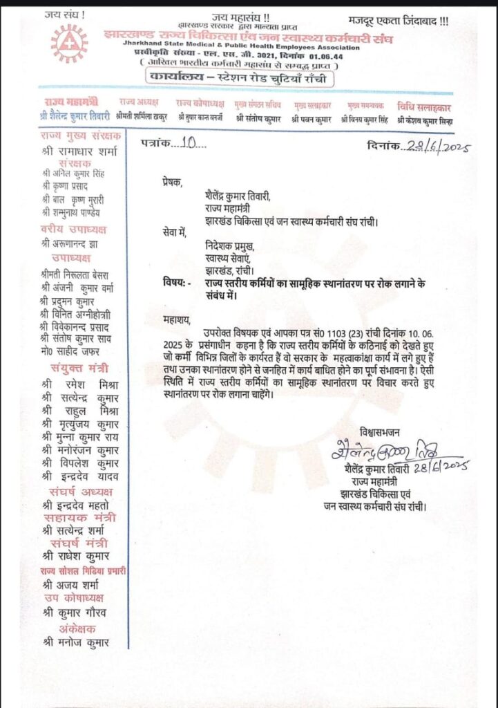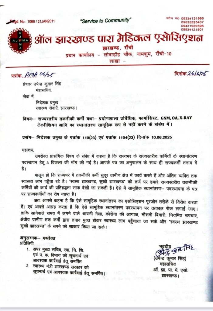 मालूम हो कि इसके पहले ऑल झारखंड पारा मेडिकल एसोसिएशन ने सामूहिक सामूहिक स्थानांतरण के पत्र के विरोध में निदेशक प्रमुख को कड़ा पत्र लिखकर आपत्ति जताई थी और कहा था कि सुदूर ग्रामीण क्षेत्र में कर्मी स्वस्थ झारखंड ,सुखी झारखंड का सपना साकार कर रहे है। सामूहिक स्थानांतरण से ये सपना साकार होने में बाधा उत्पन्न होगी। साथ ही ऐसे आदेश से कर्मियों में रोष व्याप्त है।
