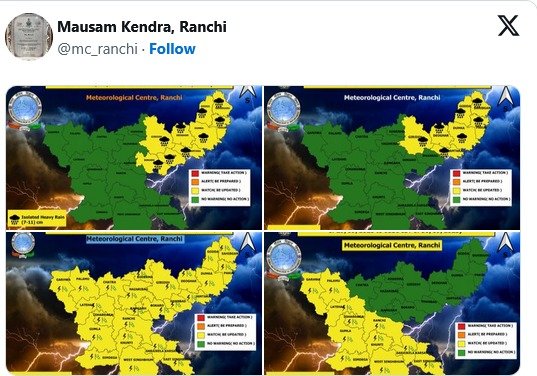 रांची मौसम केंद्र के अनुसार, 29 सितंबर को राज्य के कई जिलों – पश्चिमी सिंहभूम, पूर्वी सिंहभूम, सरायकेला-खरसांवा, सिमडेगा, रांची, बोकारो, गुमला, खूंटी, रामगढ़, कोडरमा, हजारीबाग और धनबाद – में हल्की से मध्यम बारिश और वज्रपात की संभावना है। वहीं 30 सितंबर और 1 अक्टूबर को भी कुछ जिलों में हल्की बारिश के साथ मेघगर्जन हो सकता है। अच्छी बात यह है कि नवमी तक राज्य में कहीं भी भारी बारिश की संभावना नहीं है।