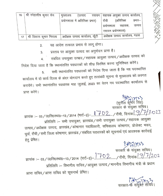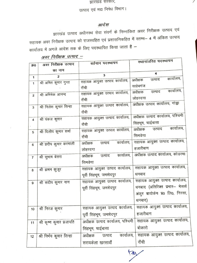 सहायक उत्पाद आयुक्त कार्यालय बोकारो में तैनात त्रिपुरारी कुमार का अधीक्षक उत्पाद कार्यालय सराकेला खरसावां, अधीक्षक उत्पाद कार्यालय दुमका में तैनात सुमितेश कुमार का सहायक उत्पाद आयुक्त कार्यालय हजारीबाग, अधीक्षक उत्पाद कार्यालय दुमका में तैनात विक्रम कुमार साह का अधीक्षक उत्पाद कार्यालय जामताड़ा