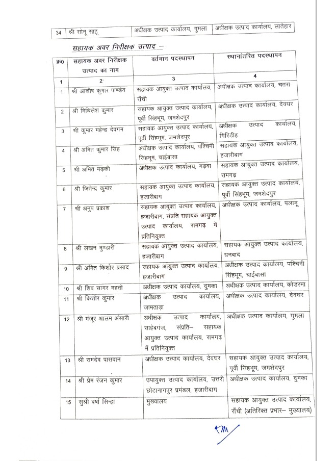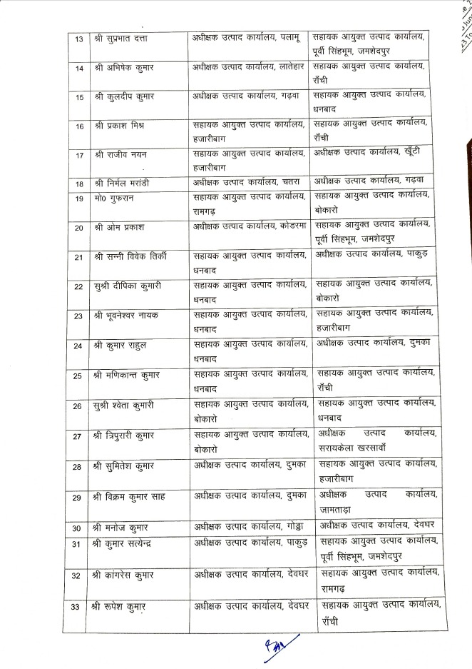अधीक्षक उत्पाद कार्यालय चाईबासा में तैनात कृष्ण कुमार प्रजापति का सहायक उत्पाद आयुक्त कार्यालय। बोकारो, अधीक्षक उत्पाद कार्यालय सरायकेला खरसावां में तैनात निर्भय कुमार सिन्हा का सहायक उत्पाद आयुक्त कार्यालय रांची, अधीक्षक उत्पाद कार्यालय पलामू में तैनात सुप्रभात दत्ता का सहायक उत्पाद आयुक्त कार्यालय जमशेदपुर, अधीक्षक उत्पाद कार्यालय में तैनात अभिषेक कुमार का सहायक उत्पाद आयुक्त कार्यालय रांची, अधीक्षक उत्पाद कार्यालय में तैनात कुलदीप कुमार का सहायक उत्पाद आयुक्त कार्यालय धनबाद